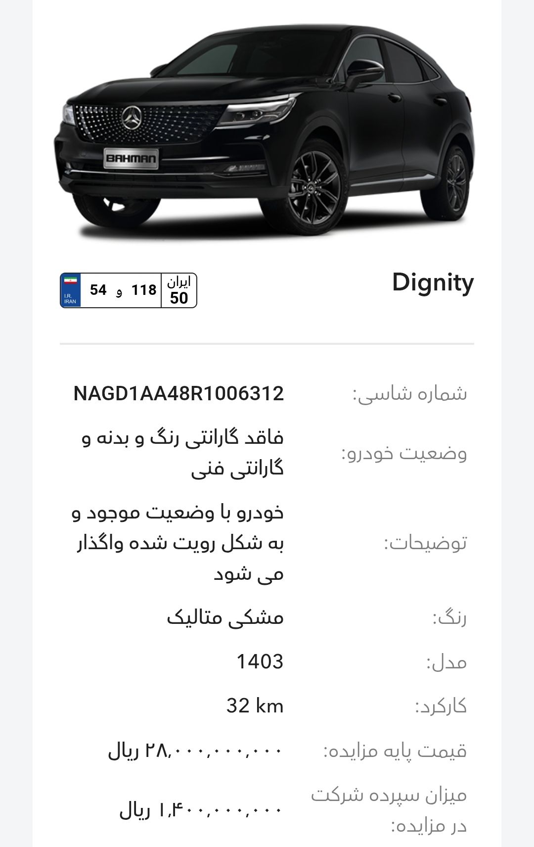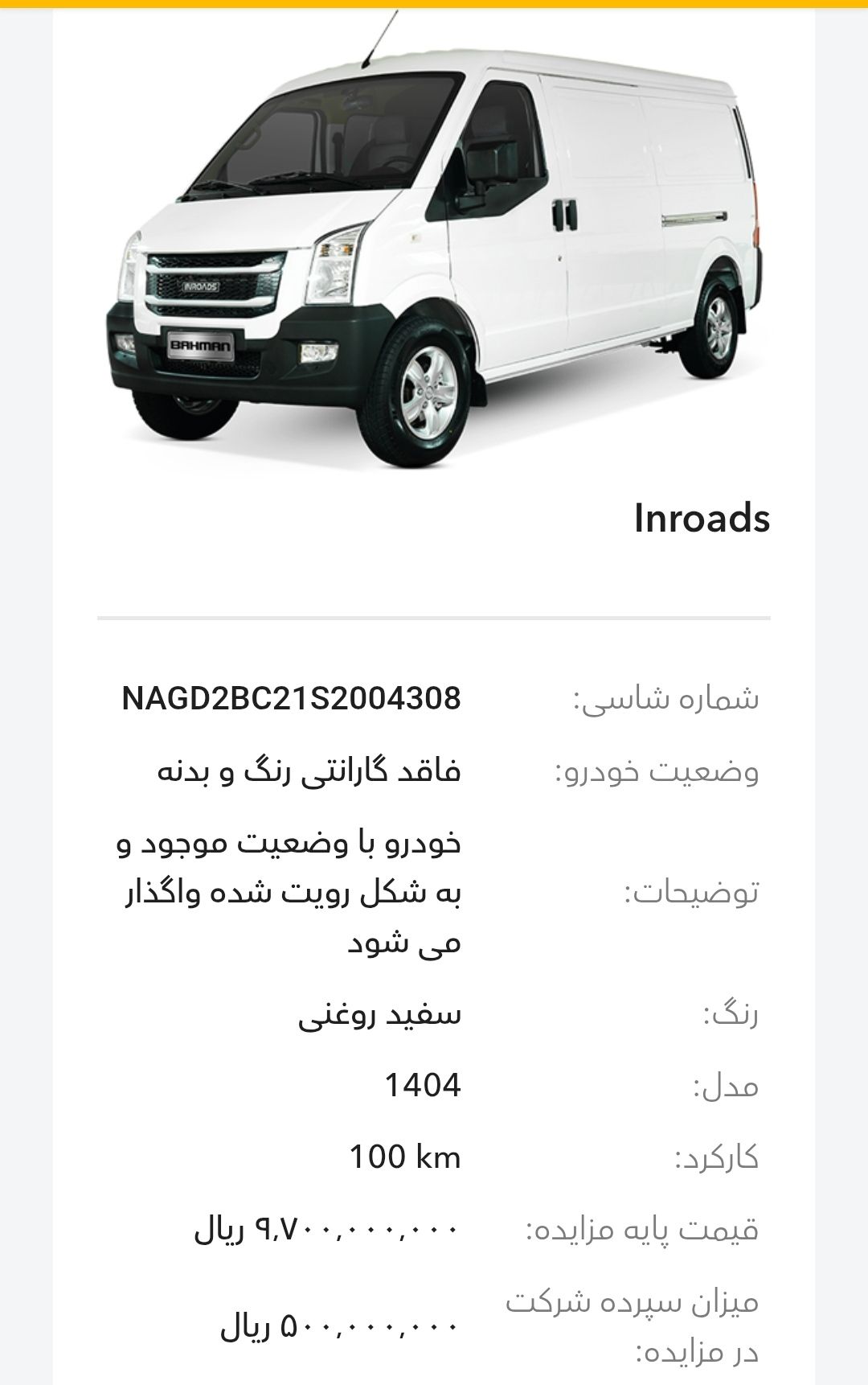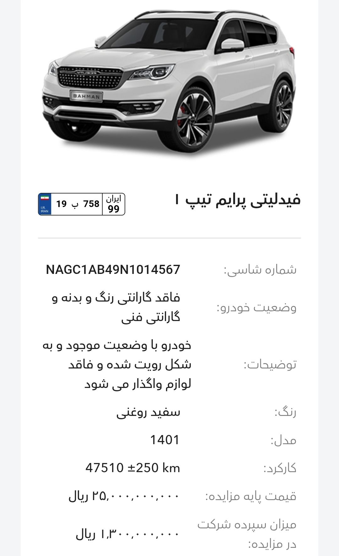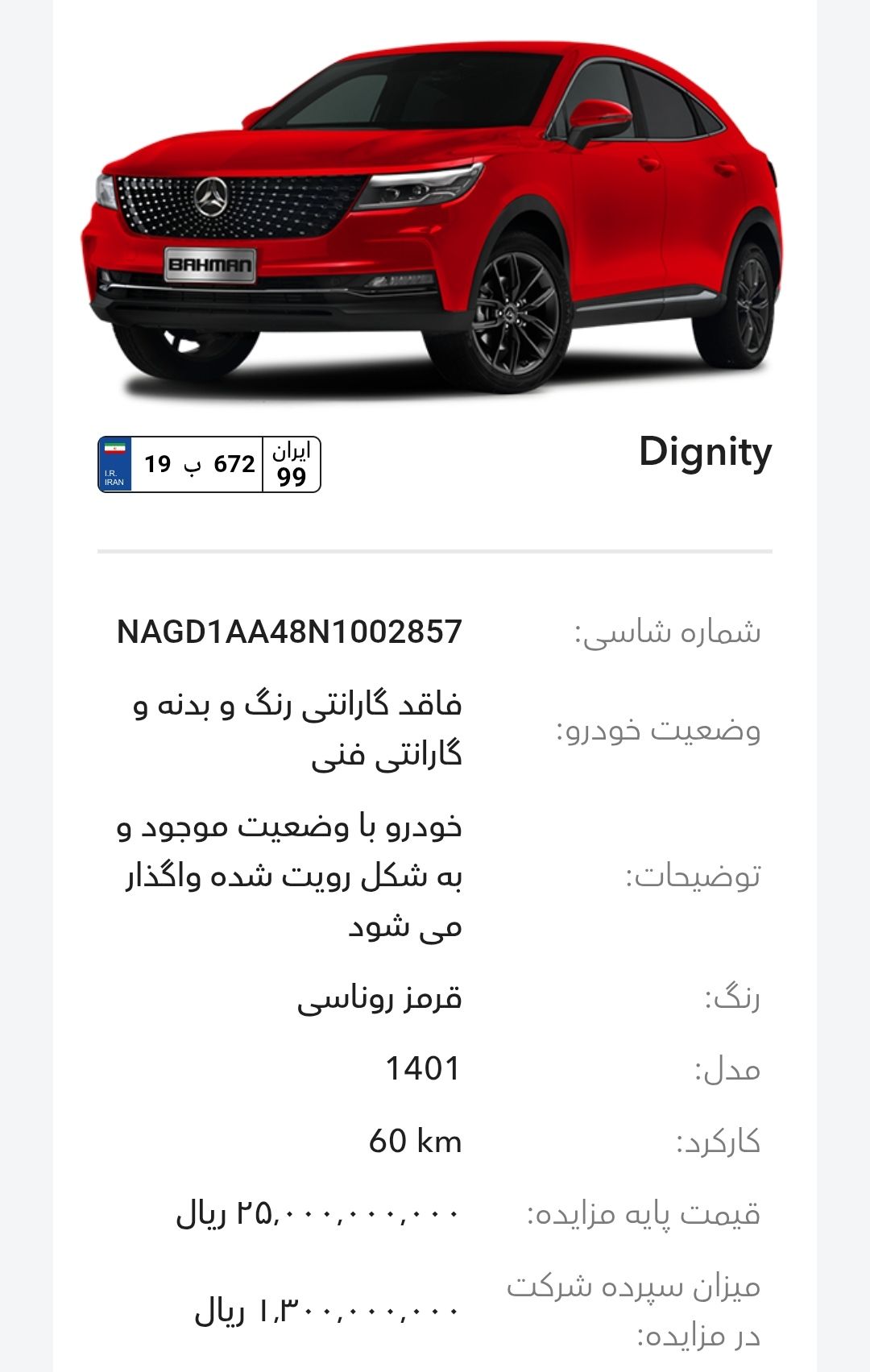مزایده شرکت گروه بهمن در سالهای اخیر بخصوص سال 1403و1404 تقریبا بصورت مرتب برگزار میشود، این مزایده از طریق سایت رسمی این شرکت به آدرسhttp://Auction.bahman.irبرگزار میشود، این مزایده ها دارای قیمت پایه هستند، برای خودروهای پلاکدار زمان تحویل کوتاه تر و برای خودروهای فاقد پلاک مراحل نصب پلاک طولانی تر هستند، بازدید همه روز بصورت عمومی ممکن است و بازدید کنندگان اجازه کارشناسی بدنه با ابزار را ندارند. مزایده بهمن موتور و بهمن دیزل(اسفند ماه):-کامیون باری فلزی بنز L1930(بهمن دیزل)-بستیون B30-هاوال H6-HEV-هونگچی EQM-5 و H5-دیگنیتی-رسپکت-فیدلیتی الیت و پرایم-کاپرا ۲-ون اینرودز-مزایده به صورت اینترنتی از طریق سایت (Auction.bahman.ir) برگزار میگردد.-مهلت بازدید، شرکت در مزایده و تهیه اسناد از تاریخ ۳ تا ۱۰ اسفند از ساعت ۸:۰۰ تا ۱۵:۰۰-مهلت ارائه پیشنهاد تا ۱۰ اسفند ساعت ۱۸:۰۰آدرس بهمن موتور: تهران، کیلومتر۱۱ جاده مخصوص کرج، انبار جهاد نصر، گروه بهمنآدرس بهمن دیزل: تهران، کیلومتر۱۷ جاده مخصوص کرج، تعمیرگاه مرکزی دیزل(کمپارس)-🔻مشاوره یک خودرو انتخابی شما ۱،۰۰۰،۰۰۰ تومان خدمت شما تقدیم میشود.-🔻مشاوره و انجام 0 تا 100 کارهای شرکت در مزایده برای شما به نام شما ۱۰،۰۰۰،۰۰۰ تومان خدمت شما تقدیم میشود.تمام پرداختی ها به حساب:۶۱۰۴۳۳۸۶۶۶۷۹۹۰۲۴میثم بهبودی شکیب.