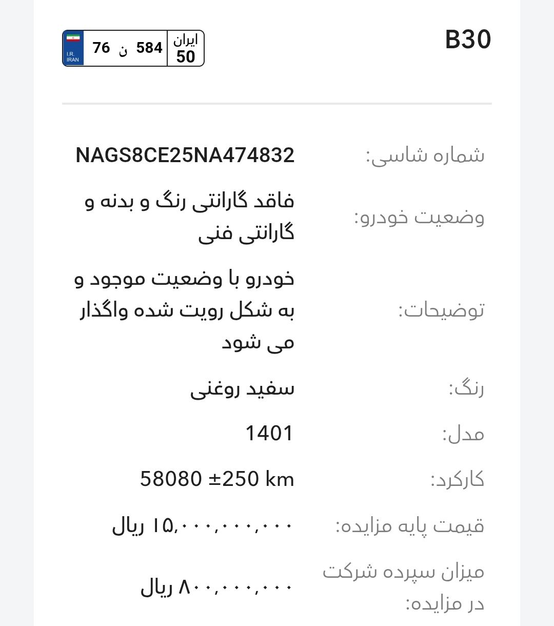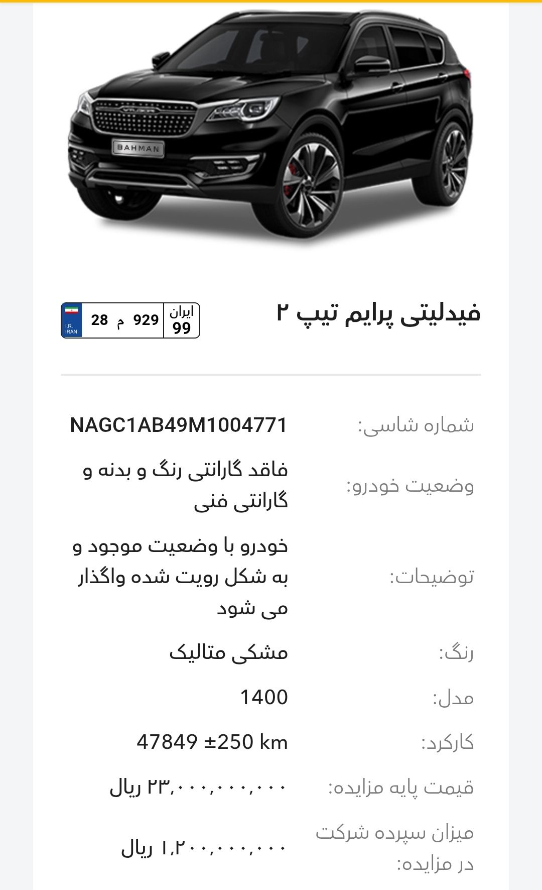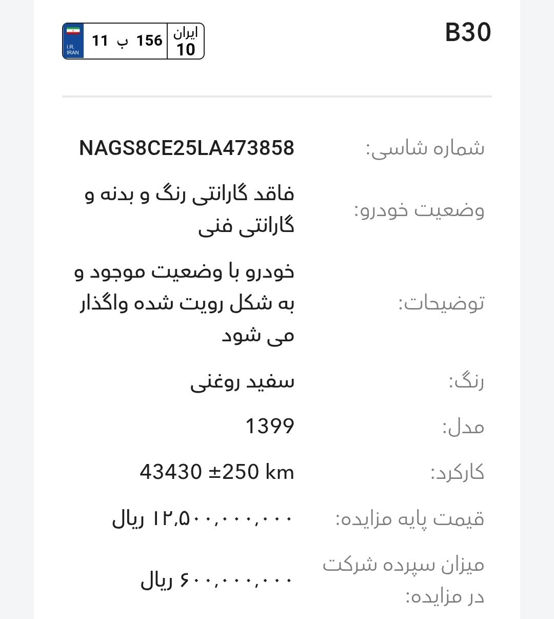 مزایده شرکت گروه بهمن در سالهای اخیر بخصوص سال 1403و1404 تقریبا بصورت مرتب برگزار میشود، این مزایده از طریق سایت رسمی این شرکت به آدرسhttp://Auction.bahman.irبرگزار میشود، این مزایده ها دارای قیمت پایه هستند، برای خودروهای پلاکدار زمان تحویل کوتاه تر و برای خودروهای فاقد پلاک مراحل نصب پلاک طولانی تر هستند، بازدید همه روز بصورت عمومی ممکن است و بازدید کنندگان اجازه کارشناسی بدنه با ابزار را ندارند. مزایده بهمن موتور و بهمن دیزل(اسفند ماه):-کامیون باری فلزی بنز L1930(بهمن دیزل)-بستیون B30-هاوال H6-HEV-هونگچی EQM-5 و H5-دیگنیتی-رسپکت-فیدلیتی الیت و پرایم-کاپرا ۲-ون اینرودز-مزایده به صورت اینترنتی از طریق سایت (Auction.bahman.ir) برگزار میگردد.-مهلت بازدید، شرکت در مزایده و تهیه اسناد از تاریخ ۳ تا ۱۰ اسفند از ساعت ۸:۰۰ تا ۱۵:۰۰-مهلت ارائه پیشنهاد تا ۱۰ اسفند ساعت ۱۸:۰۰آدرس بهمن موتور: تهران، کیلومتر۱۱ جاده مخصوص کرج، انبار جهاد نصر، گروه بهمنآدرس بهمن دیزل: تهران، کیلومتر۱۷ جاده مخصوص کرج، تعمیرگاه مرکزی دیزل(کمپارس)-🔻مشاوره یک خودرو انتخابی شما ۱،۰۰۰،۰۰۰ تومان خدمت شما تقدیم میشود.-🔻مشاوره و انجام 0 تا 100 کارهای شرکت در مزایده برای شما به نام شما ۱۰،۰۰۰،۰۰۰ تومان خدمت شما تقدیم میشود.تمام پرداختی ها به حساب:۶۱۰۴۳۳۸۶۶۶۷۹۹۰۲۴میثم بهبودی شکیب.