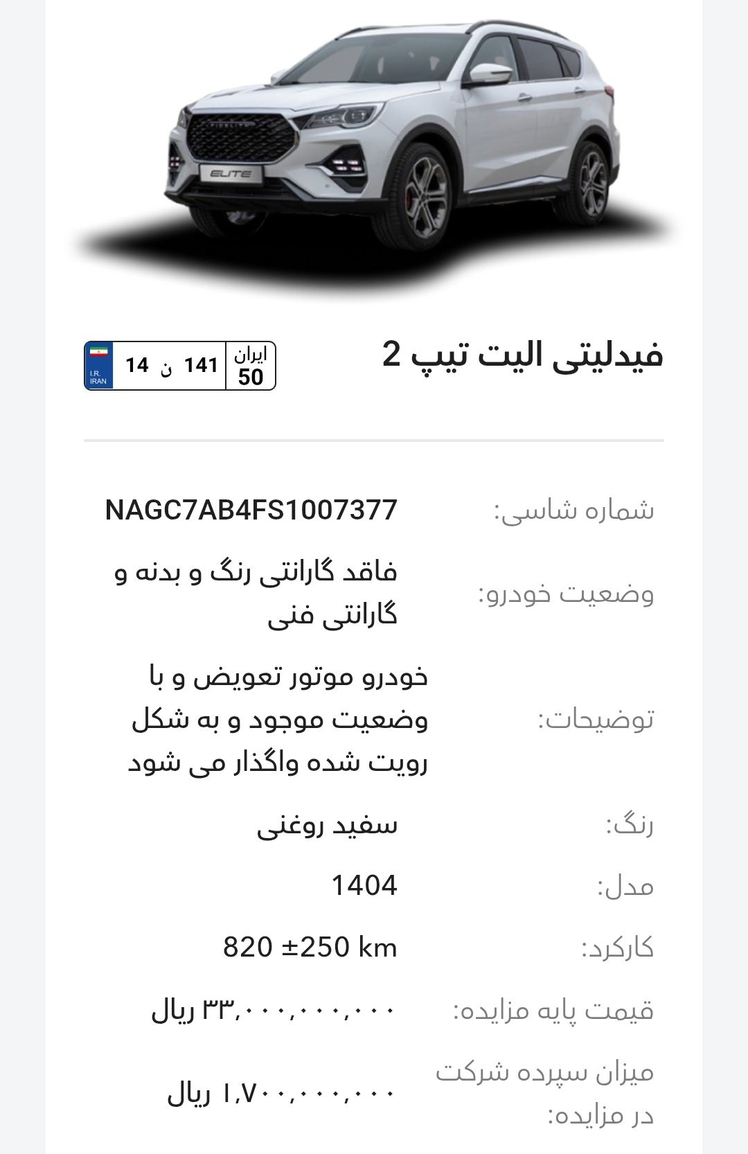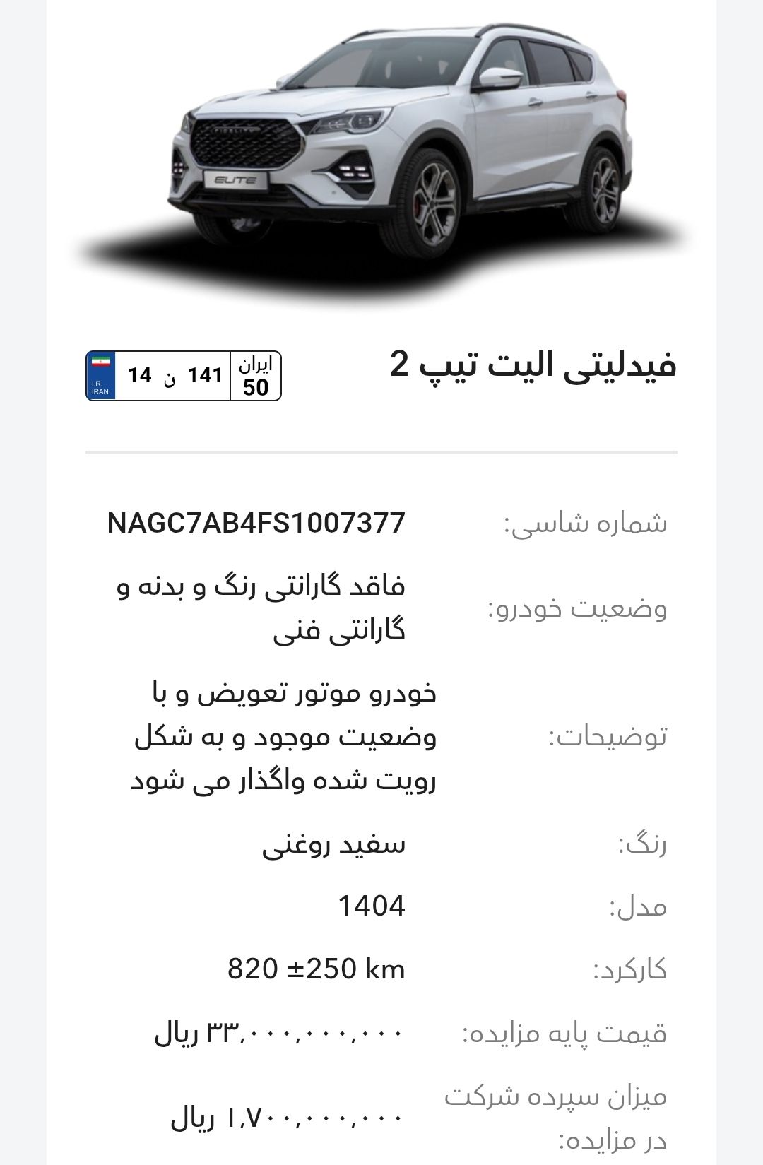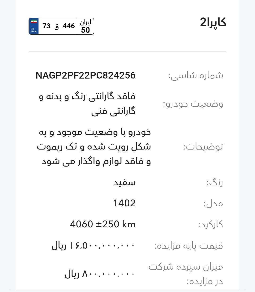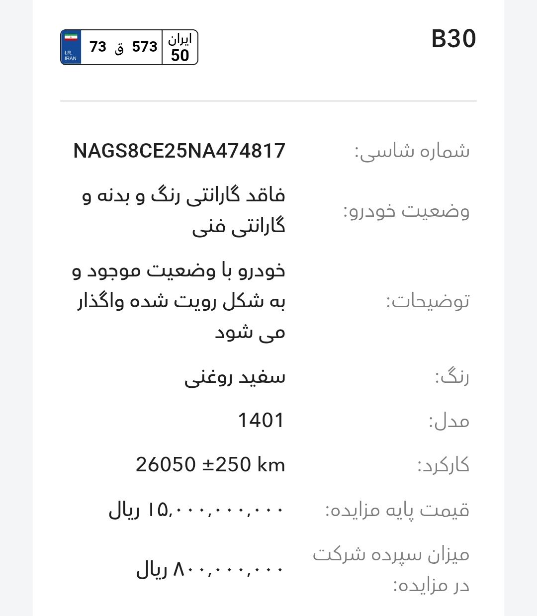 مزایده شرکت گروه بهمن در سالهای اخیر بخصوص سال 1403و1404 تقریبا بصورت مرتب برگزار میشود، این مزایده از طریق سایت رسمی این شرکت به آدرسhttp://Auction.bahman.irبرگزار میشود، این مزایده ها دارای قیمت پایه هستند، برای خودروهای پلاکدار زمان تحویل کوتاه تر و برای خودروهای فاقد پلاک مراحل نصب پلاک طولانی تر هستند، بازدید همه روز بصورت عمومی ممکن است و بازدید کنندگان اجازه کارشناسی بدنه با ابزار را ندارند. مزایده بهمن موتور و بهمن دیزل(اسفند ماه):-کامیون باری فلزی بنز L1930(بهمن دیزل)-بستیون B30-هاوال H6-HEV-هونگچی EQM-5 و H5-دیگنیتی-رسپکت-فیدلیتی الیت و پرایم-کاپرا ۲-ون اینرودز-مزایده به صورت اینترنتی از طریق سایت (Auction.bahman.ir) برگزار میگردد.-مهلت بازدید، شرکت در مزایده و تهیه اسناد از تاریخ ۳ تا ۱۰ اسفند از ساعت ۸:۰۰ تا ۱۵:۰۰-مهلت ارائه پیشنهاد تا ۱۰ اسفند ساعت ۱۸:۰۰آدرس بهمن موتور: تهران، کیلومتر۱۱ جاده مخصوص کرج، انبار جهاد نصر، گروه بهمنآدرس بهمن دیزل: تهران، کیلومتر۱۷ جاده مخصوص کرج، تعمیرگاه مرکزی دیزل(کمپارس)-🔻مشاوره یک خودرو انتخابی شما ۱،۰۰۰،۰۰۰ تومان خدمت شما تقدیم میشود.-🔻مشاوره و انجام 0 تا 100 کارهای شرکت در مزایده برای شما به نام شما ۱۰،۰۰۰،۰۰۰ تومان خدمت شما تقدیم میشود.تمام پرداختی ها به حساب:۶۱۰۴۳۳۸۶۶۶۷۹۹۰۲۴میثم بهبودی شکیب.