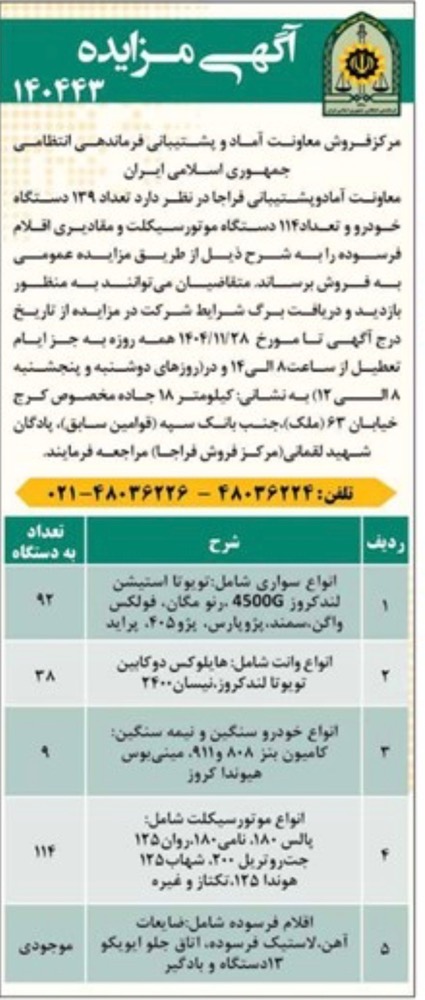 مزایده فراجا شامل انواع خودروهای سبک و سنگین+بصورت پاکتی+ضمانت نامه بانکی به عنوان ودیعه+بدون قیمت پایه سلام ارادت مزایدات منتشر شده در سایت مزایده لند از منابع رسمی انتشار مزایدات استخراج میشود و این آگهی ها همه بدون تصرف و تغییر انتشار داده میشود.برای خدماتی که ما میتوانیم در خدمت باشیم از طریق کانالهای ارتباطی ما در واتساپ، تلگرام، اینستاگرام و پلتفرم های ملی مثل روبیکا و بله اقدام بفرمایید.شماره 09053333516 بر روی تمامی این شبکه ها فعال است.در صورت شرکت کردن مستقل در مزایدات لطفا توجه به هزینه ها و ریسک های موجود داشته باشید و تحلیل های درست را ابزار پیشنهاد قیمت قرار دهید.