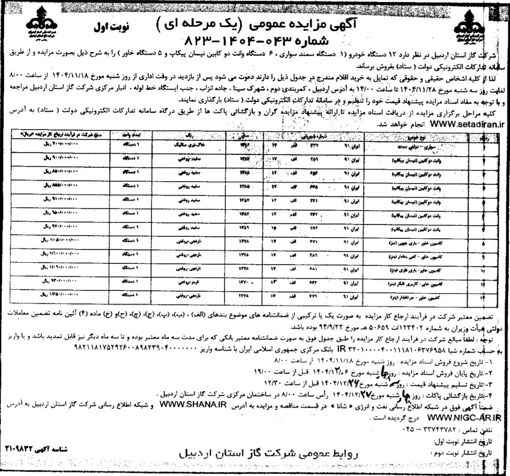 شامل پیکاپ و کامیونت+بصورت اینترنتی از طریق سایت ستاد سلام ارادت مزایدات منتشر شده در سایت مزایده لند از منابع رسمی انتشار مزایدات استخراج میشود و این آگهی ها همه بدون تصرف و تغییر انتشار داده میشود.برای خدماتی که ما میتوانیم در خدمت باشیم از طریق کانالهای ارتباطی ما در واتساپ، تلگرام، اینستاگرام و پلتفرم های ملی مثل روبیکا و بله اقدام بفرمایید.شماره 09053333516 بر روی تمامی این شبکه ها فعال است.در صورت شرکت کردن مستقل در مزایدات لطفا توجه به هزینه ها و ریسک های موجود داشته باشید و تحلیل های درست را ابزار پیشنهاد قیمت قرار دهید.