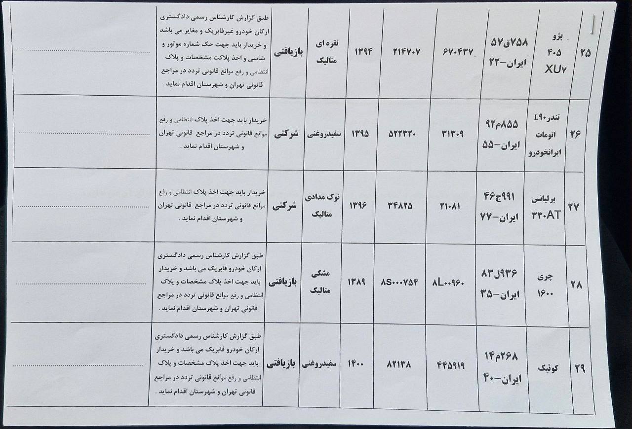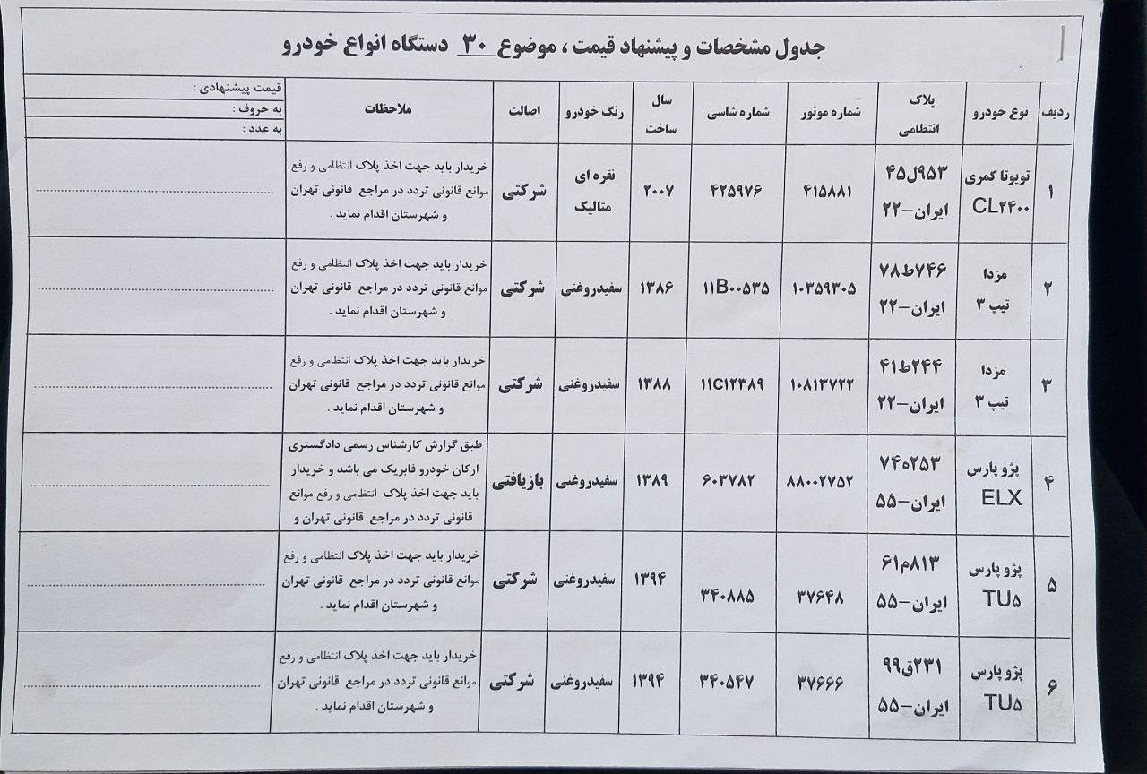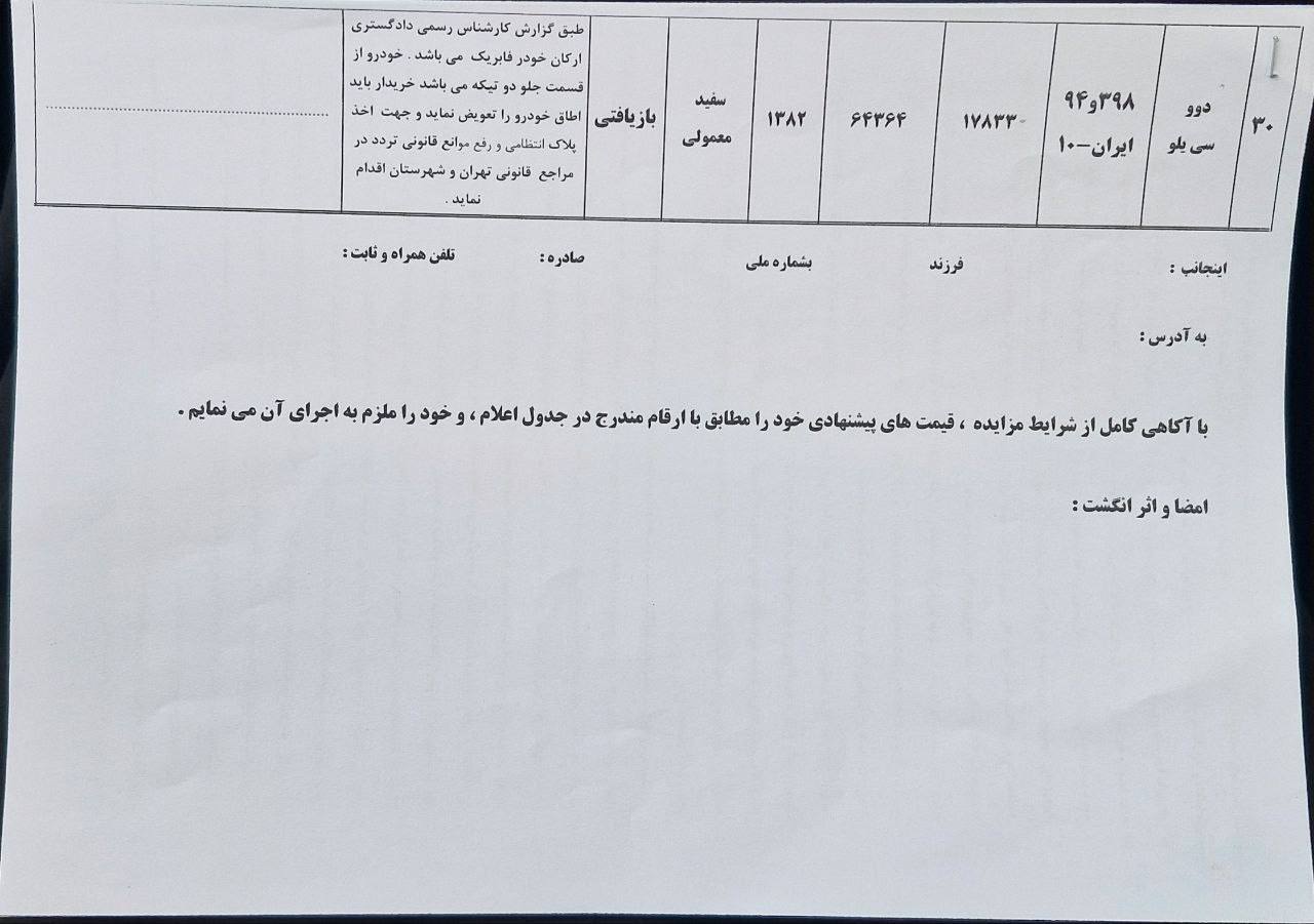 -مزایده بیمه البرز:-مزایده به صورت حضوری برگزار میگردد.-مهلت بازدید و ارائه پیشنهاد تا ۶ اسفند ماه از ساعت ۸:۰۰ الی ۱۵:۰۰آدرس: تهران، خیابان سپهبد قرنی، نبش کوچه حقیقت طلب، مجتمع بیمه های اشخاص این مزایده بصورت حضوری(پاکتی) برگزار میشود، فاقد قیمت پایه میباشد، این گونه مزایدات نیاز به بررسی دارد چرا که خودروها از ابتدا شخصی بوده است و ممکن است دارای فریب ها و تکنیک های بازار خودرو باشد این موضوع لزوم کارشناسی و بررسی را بسیار مهم و الزامی میکند. در مورد اینگونه مزایده ها پیشنهاد قیمت به اضافه فرم(اسناد)پیشنهاد قیمت میباید در زمان مشخص تحویل سازمان گردد. لیست خودروها در عکس ها موجود میباشد.