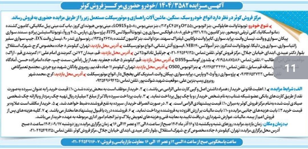 مزایدات مرکز فروش کوثر بصورت حراج(چوب زنی) برگزار میشود، این مزایدات بصورت حضوری و اعلام پیشنهاد بصورت شفاهی برگزار میشود، معمولا 3روز مجموعا فرصت دارد که شامل 2روز بازدید و روز سوم برگزاری میباشد. در این مزایدات قیمت پایه معمولا یا کتبی نوشته شده است یا در روز سوم( روز برگزاری) توسط مسئول برگزاری اعلام میشود. برای پیشنهاد قیمت نیاز به ودیعه ندارد. فقط بدانید برنده شدید میبایست در محل معادل 10%را کارت بکشید و یا چک تحویل دهید.