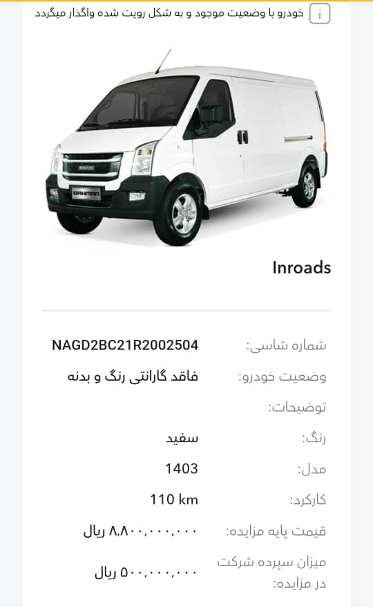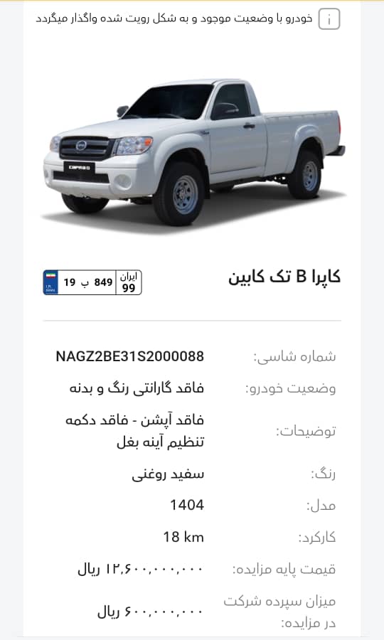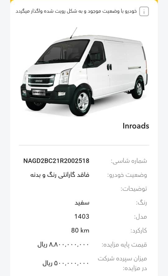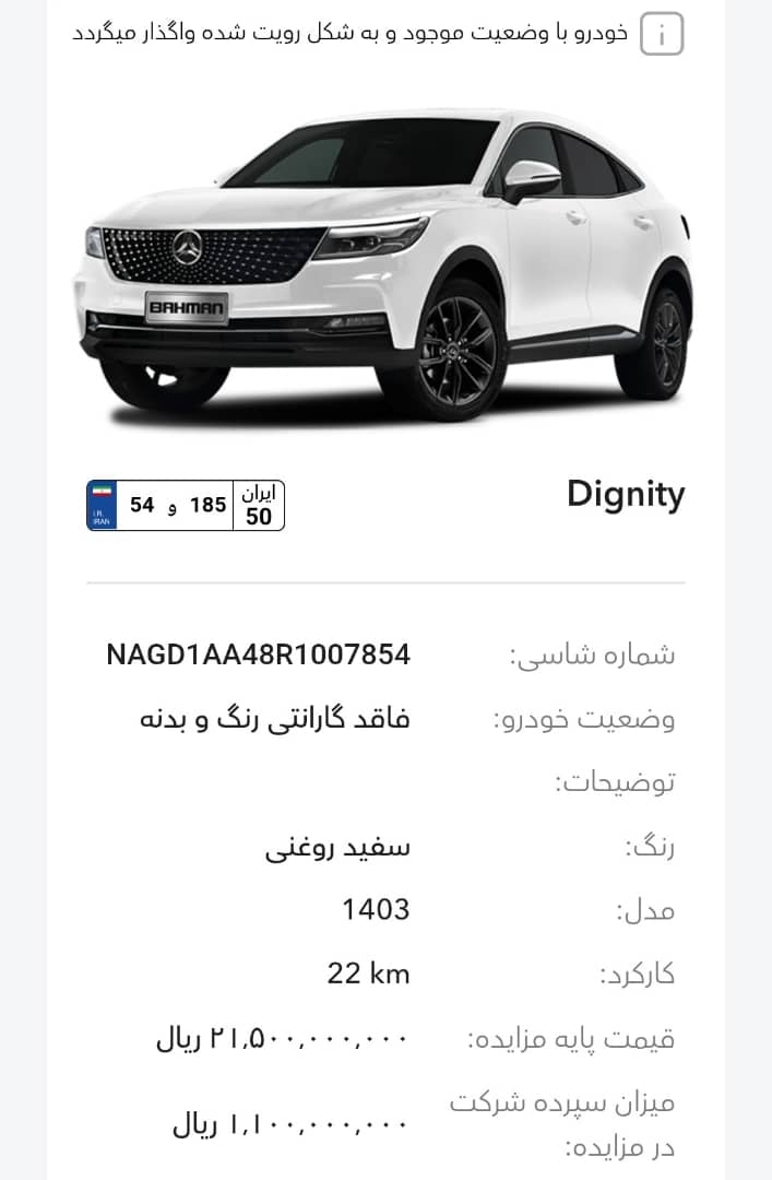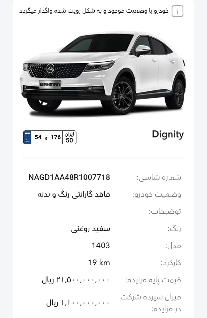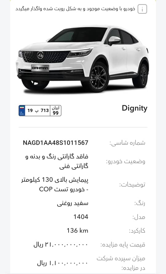 این مزایده بصورت اینترنتی از طریق سایت این شرکت به آدرس auction.bahman.irبرگزار میشود. خودروها شامل موارد دارای گارانتی و فاقد گارانتی میباشد. خودروها قیمت پایه دارند. برای بازدید همه روز در تایم اداری در روزهای غیر تعطیل به آدرس تهران، کیلومتر 11جاده مخصوص، انبار بهمن موتور مراجعه کنید