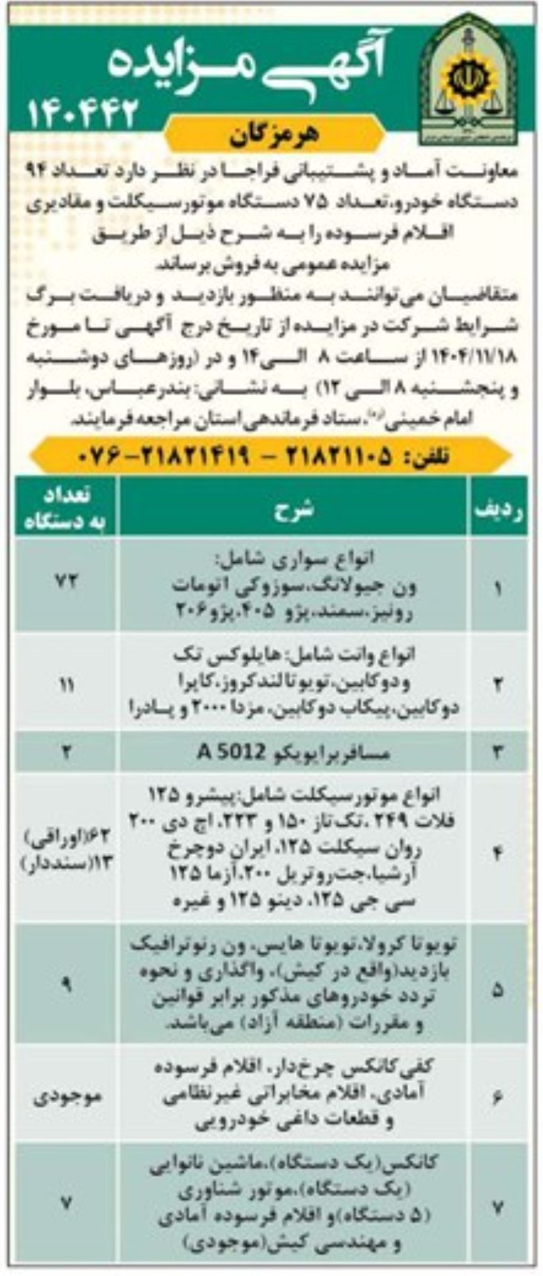 مزایده های فراجا بصورت پاکتی برگزار میشود، ضمانت نامه بانکی به عنوان ودیعه لازم دارد، قیمت پایه ندارد، خودروهای وارداتی هزینه های قانونی مختلف دارند، سلام ارادتبصورت موقت مارا در شبکه های اجتماعی داخلی👇روبیکامرکز و مرجع رایگان اطلاع رسانی مزایده های خودروکارشناسی، مشاوره، همراهیhttps://rubika.ir/mozaedelandبله👇«مزایده لند(مزایده خودرو)»مزایده لند سالهاست رایگان مزایده خودرو منتشر میکند. درآمد ما از کارشناسی،مشاوره و همراهی کسب میشود.🆔 شناسه:https://ble.ir/mozaedelandو البته سایت ما به آدرس 👇www.mozaedeland.irدنبال کنید🙏😔